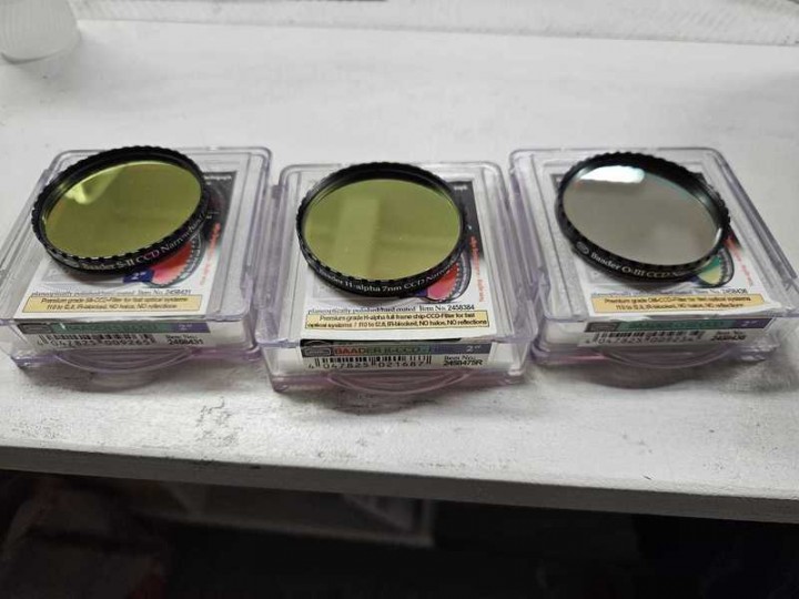 Vendo set di filtri a banda stretta Ha, OIII, SII , rispettivamente 7nm, 8,5 nm e 8 nm, da 2" con telaio. Compreso la loro custodia originale. Usabili da F/10 a f/2.8.