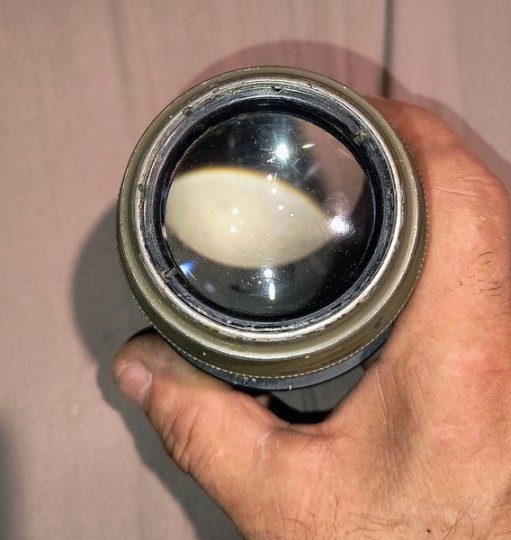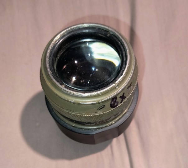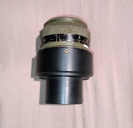 Oculare militare con adattatore da 2". Lente frontale e campo enorme. Piccolo striscio sulla lente ma non pregiudica l'eccellente visione cristallina. Dovrebbe avere focale di 15mm.