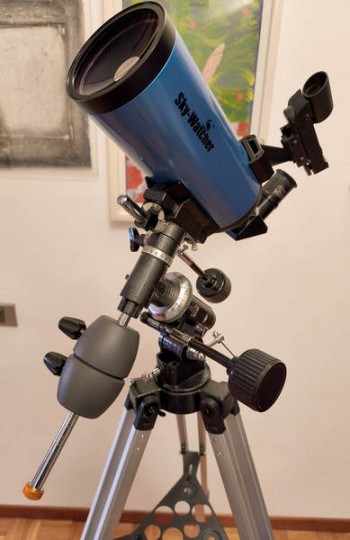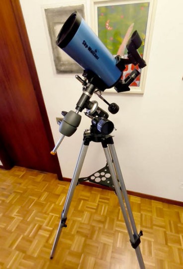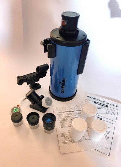 Telescopio Sky Watcher Maksutov 90/1250 con montatura equatoriale, cercatore con punto luminoso, tre oculari (6, 9 e 20 mm.), prisma diagonale, tappi, libretto istruzioni.