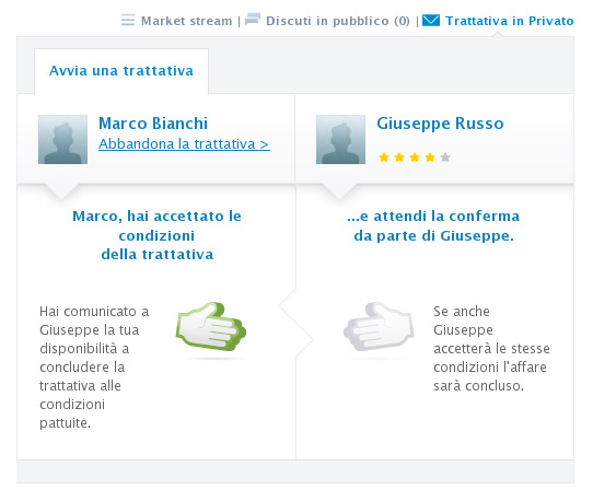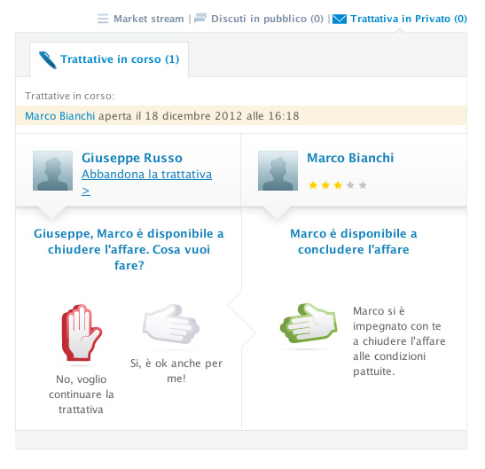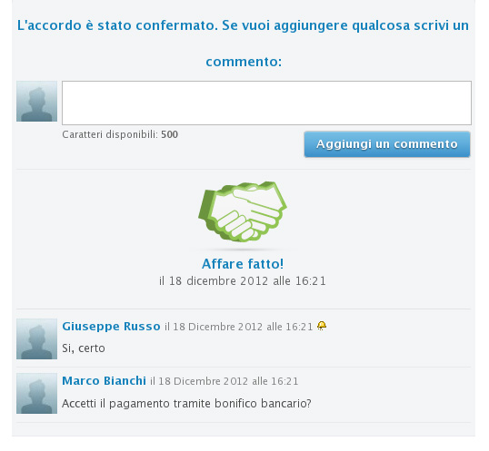 Quando entrambi i partecipanti hanno confermato il loro impegno a concludere una trattativa l'annuncio viene considerato chiuso e non sarà possibile avviare ulteriori trattative per lo stesso annuncio. Eventuali altre trattative in corso (per lo stesso annuncio) verranno a loro volta considerate chiuse.