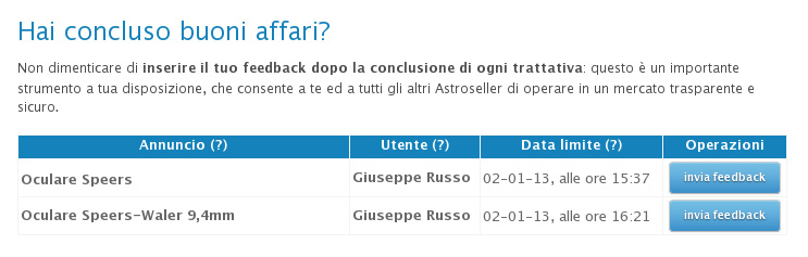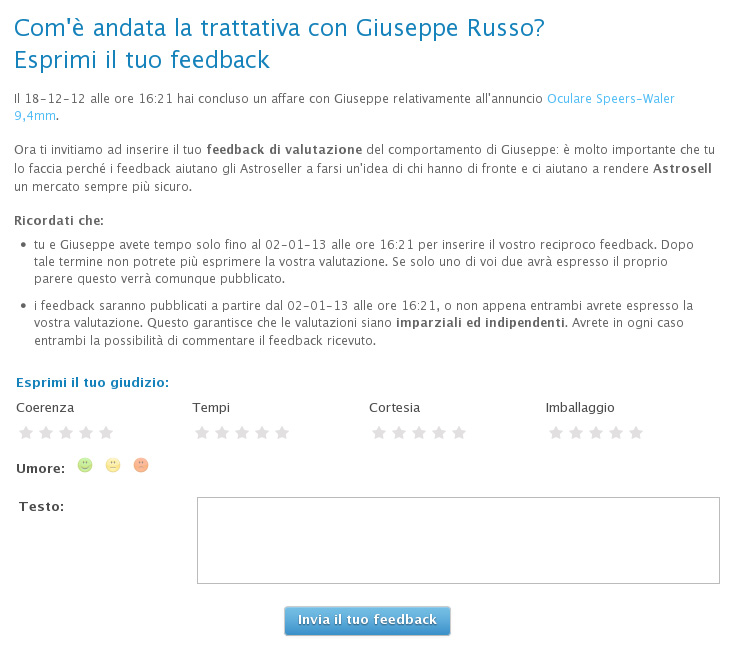 Conclusa la trattativa avrai la possibilità di esprimere la tua opinione nei confronti dell'altro Astroseller, attraverso l'inserimento di un feedback. Non sarà necessario inserire immediatamente il feedback, avrai a disposizione 21 giorni (a partire dalla conclusione della trattativa) per esercitare questo tuo diritto.